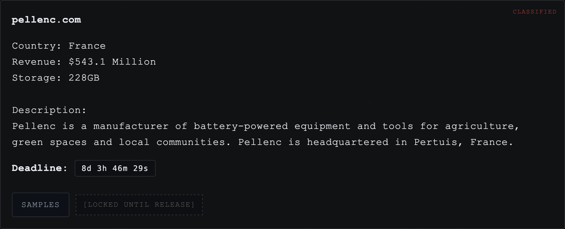 | pellenc.com | Country: France Revenue: $543.1 Million Storage: 228GB Description: Pellenc is a manufacturer of battery-powered equipment and tools for agriculture, green spaces and local communities. Pellenc is headquartered in Pertuis, France. | Screen | |
