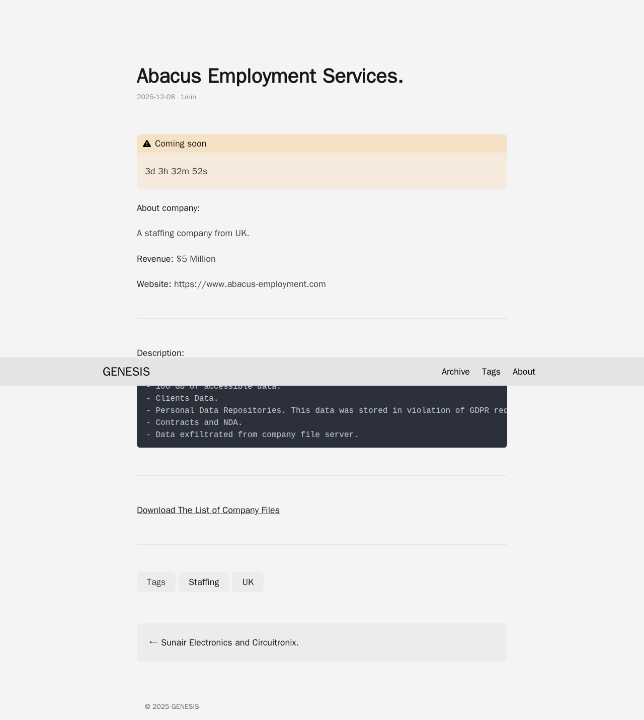 | Claimlinx | About company: ClaimLinx helps businesses by providing health insurance benefits for their employees. Revenue: $6 Million Website: https://www.claimlinx.com Description: - 200 GB of accessible data. - Data from the company's file server. - Banks of clients personal data. - Banks of clients medical data. - Financial data. | Screen | |