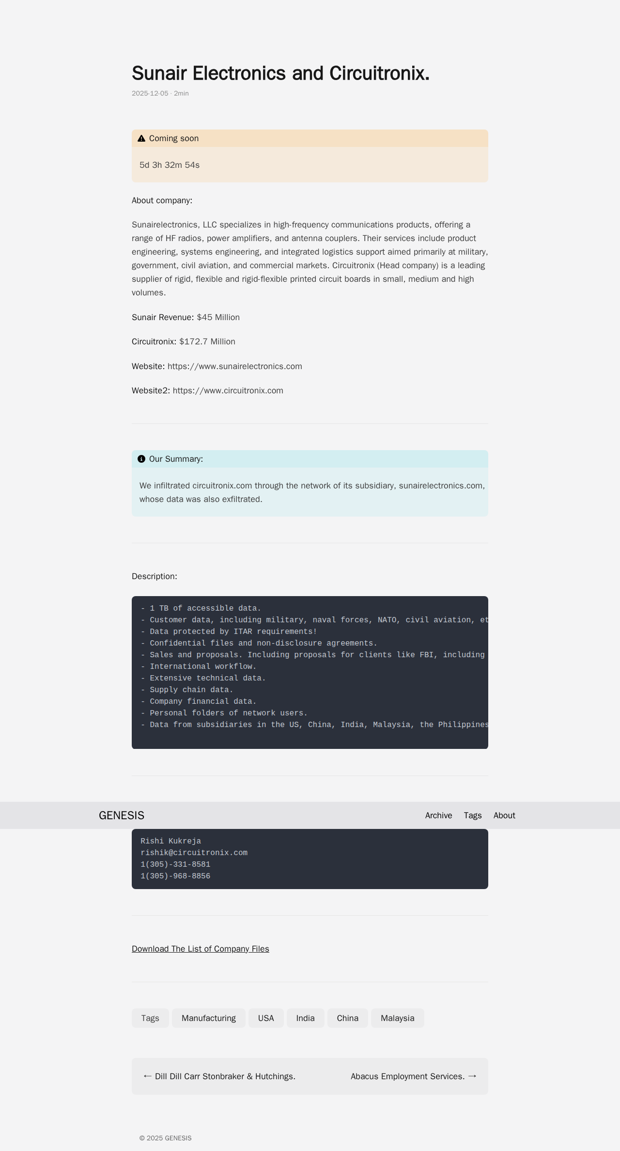 | I-Tek Medical Technologies | About company: I-Tek Medical Technologies is a leading provider of contract design, development, and manufacturing in a healthcare industry. Revenue: $6 Million Website: https://i-tekmedical.com Description: - 120 GB of accessible data. - Data from the company's file server. - Detailed technical data. - Contracts and NDA. - SQL backups. | Screen |