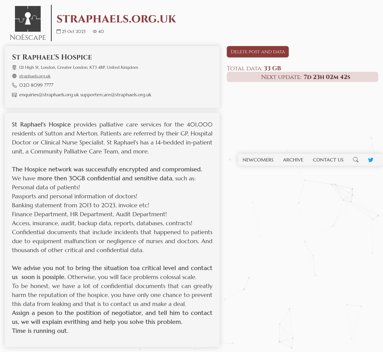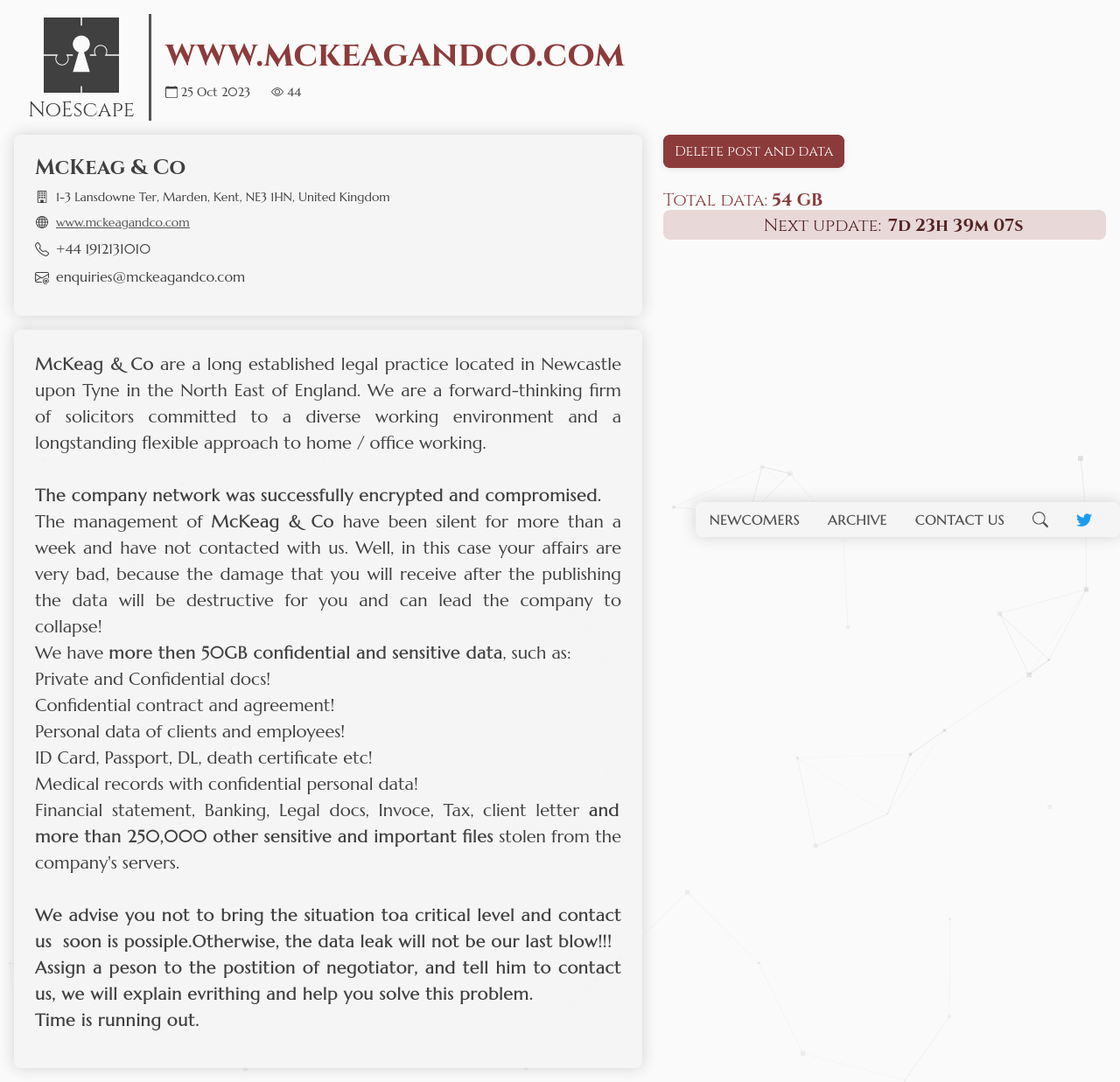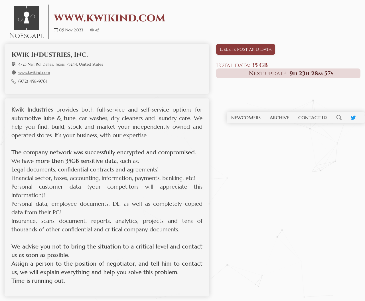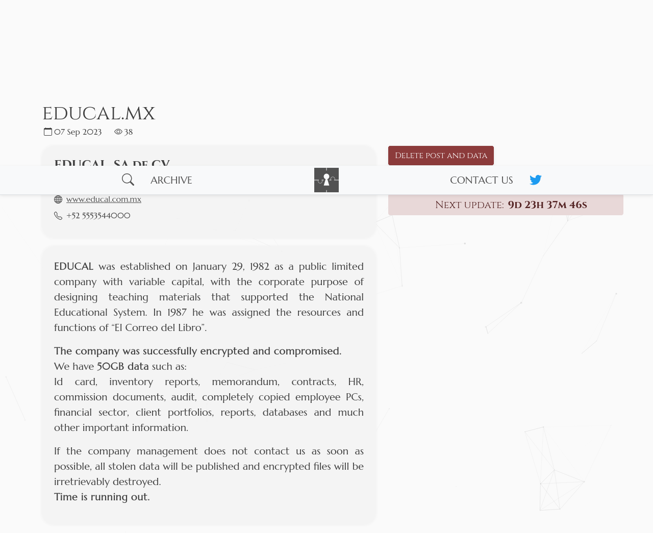 If the company does not contact and cooperate by the end of the time counter, then we will leak all their important files and documents, including secret tax documents.