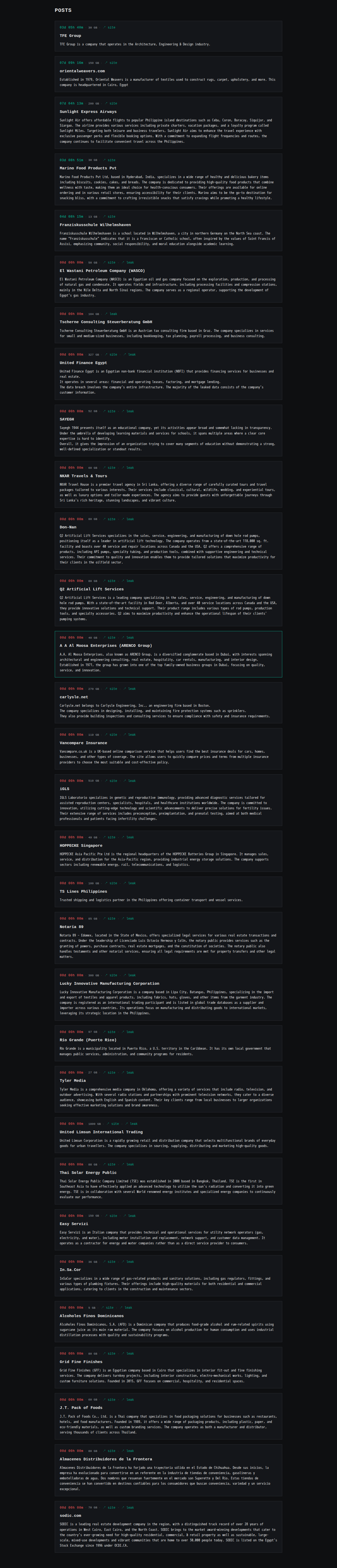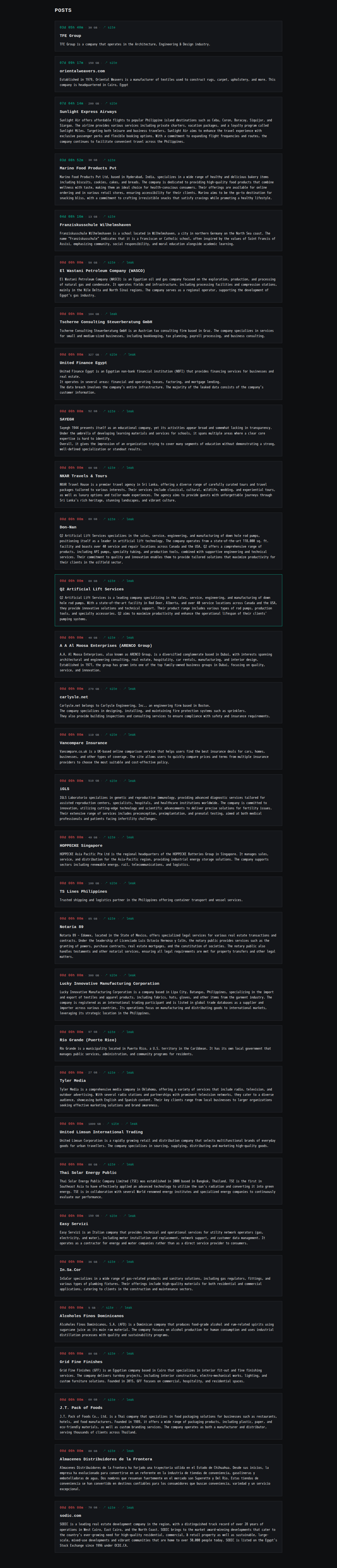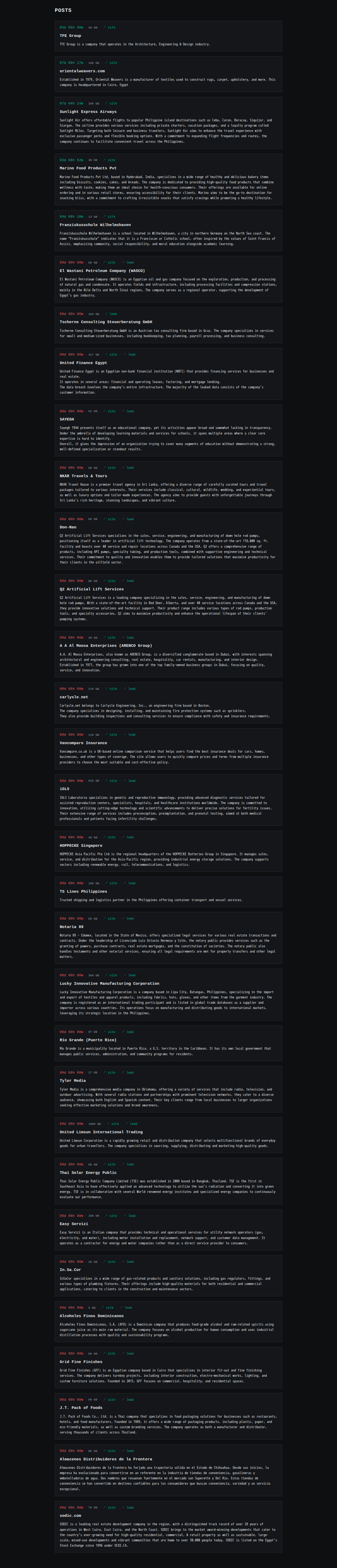 | United Finance Egypt | United Finance Egypt is an Egyptian non-bank financial institution (NBFI) that provides financing services for businesses and real estate. It operates in several areas: financial and operating leases, factoring, and mortgage lending. The data breach involves the company’s entire infrastructure. The majority of the leaked data consists of the company’s customer information. | Screen | |