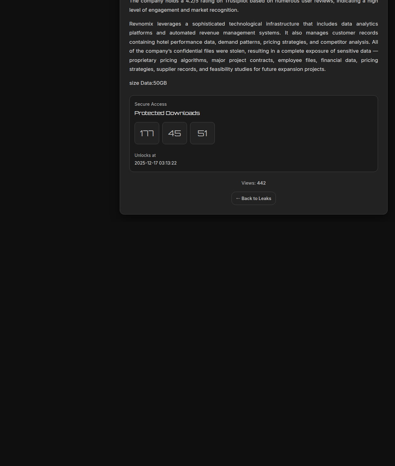 | Tengu - TENGU Ransomware | Leaks TENGU Ransomware You are on the page of the media outlet “TENGU”. PUBLISHED 28VIEWS 0IMAGES URL Data No targets listed Home Print ID: 11 TENGU Ransomware You are on the page of the media outlet “TENGU”. ⏱ 228h 48m 06s 28 views You are now on the Tengo Media Foundation page.- Who are we?We specialize in publishing corporate data leaks provided by our anonymous sources.All data published in our articles and investigations is 100% original and exclusive, directly sourced from corporate computer networks.- How can I view the leaks?In each press release, you will find the "Description" and "Download" tabs."Description" is our investigative article, which includes a detailed story about the files found in the leak, along with additional private information from our editorial team."Download" is the company's file access system, allowing for preview and download. This tab becomes available after a specified period of time after the press release is published. Views: 28 ← Back / |