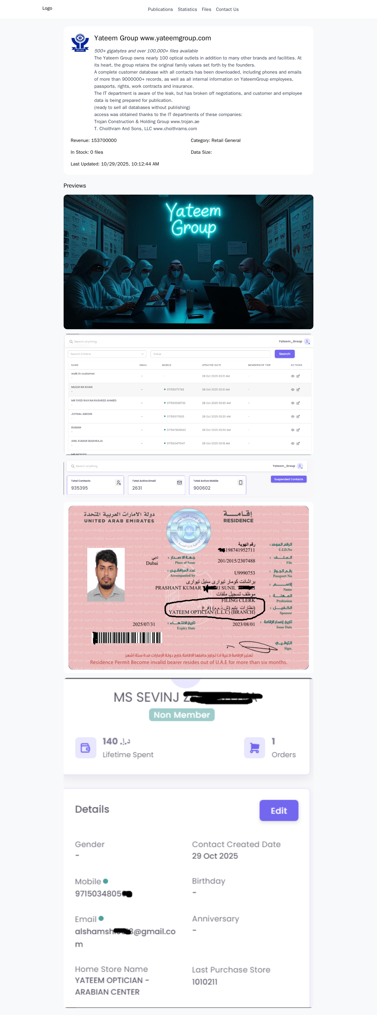 <p><strong><em>500+ gigabytes and over 100,000+ files available</em></strong></p><p></p><p>The Yateem Group owns nearly 100 optical outlets in addition to many other brands and facilities. At its heart, the group retains the original family values set forth by the founders.</p><p>A complete customer database with all contacts has been downloaded, including phones and emails of more than 9000000+ records, as well as all internal information on YateemGroup employees, passports, rights, work contracts and insurance.</p><p>The IT department is aware of the leak, but has broken off negotiations, and customer and employee data is being prepared for publication.</p><p>(ready to sell all databases without publishing)</p><p></p><p><strong>access was obtained thanks to the IT departments of these companies:</strong></p><p><strong>Trojan Construction & Holding Group www.trojan.ae</strong></p><p><strong>T. Choithram And Sons, LLC www.choithrams.com</strong></p>