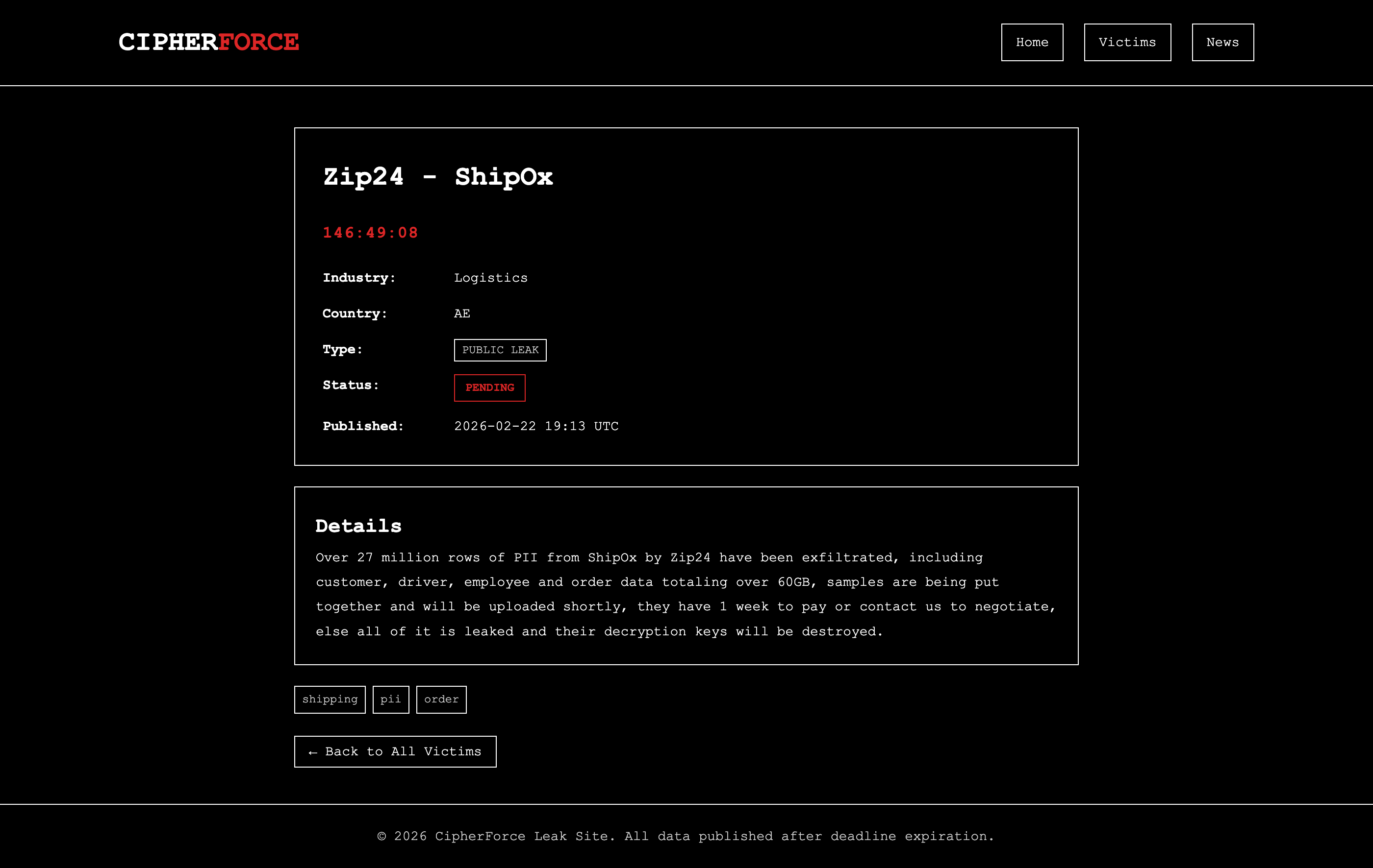 Over 27 million rows of PII from ShipOx by Zip24 have been exfiltrated, including customer, driver, employee and order data totaling over 60GB, samples are being put together and will be uploaded shortly, they have 1 week to pay or contact us to negotiate, else all of it is leaked and their decryption keys will be destroyed.
