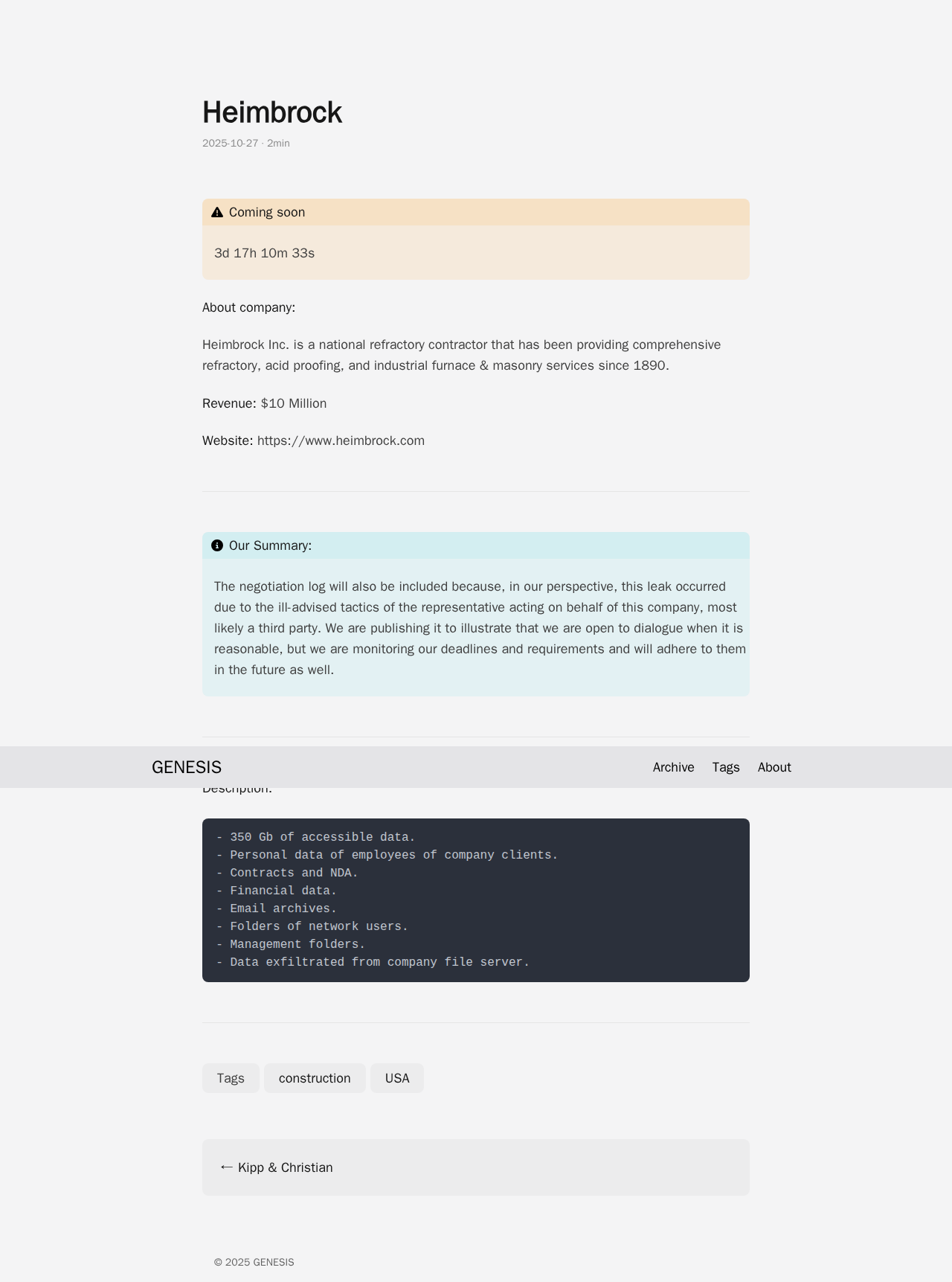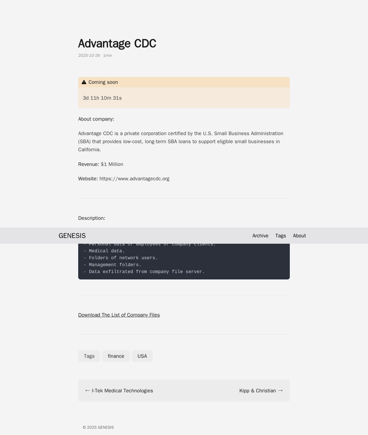 | Claimlinx | About company: ClaimLinx helps businesses by providing health insurance benefits for their employees. Revenue: $6 Million Website: https://www.claimlinx.com Description: - 200 GB of accessible data. - Data from the company's file server. - Banks of clients personal data. - Banks of clients medical data. - Financial data. | Screen | |