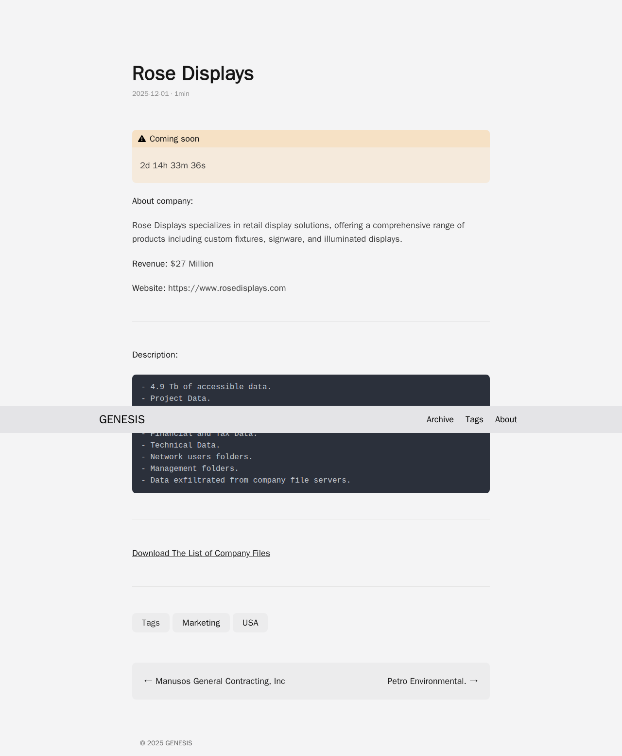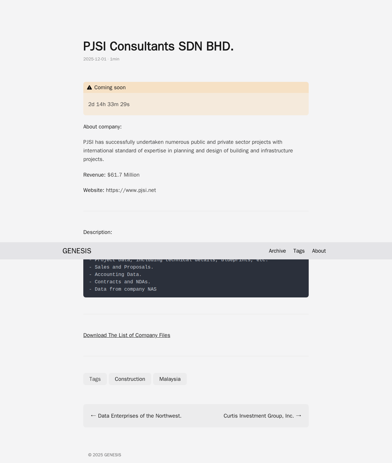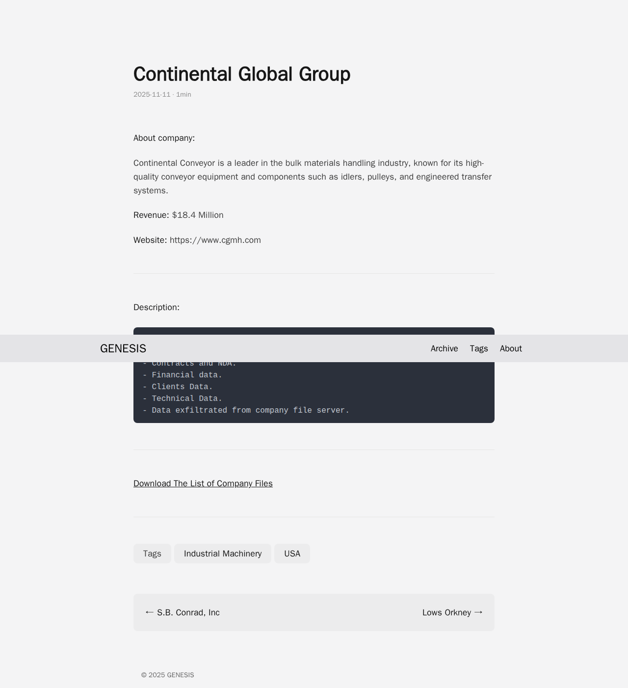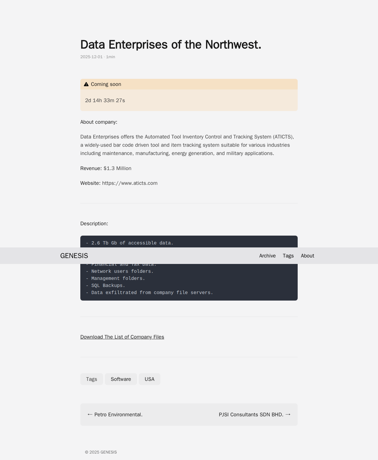 | I-Tek Medical Technologies | About company: I-Tek Medical Technologies is a leading provider of contract design, development, and manufacturing in a healthcare industry. Revenue: $6 Million Website: https://i-tekmedical.com Description: - 120 GB of accessible data. - Data from the company's file server. - Detailed technical data. - Contracts and NDA. - SQL backups. | Screen |