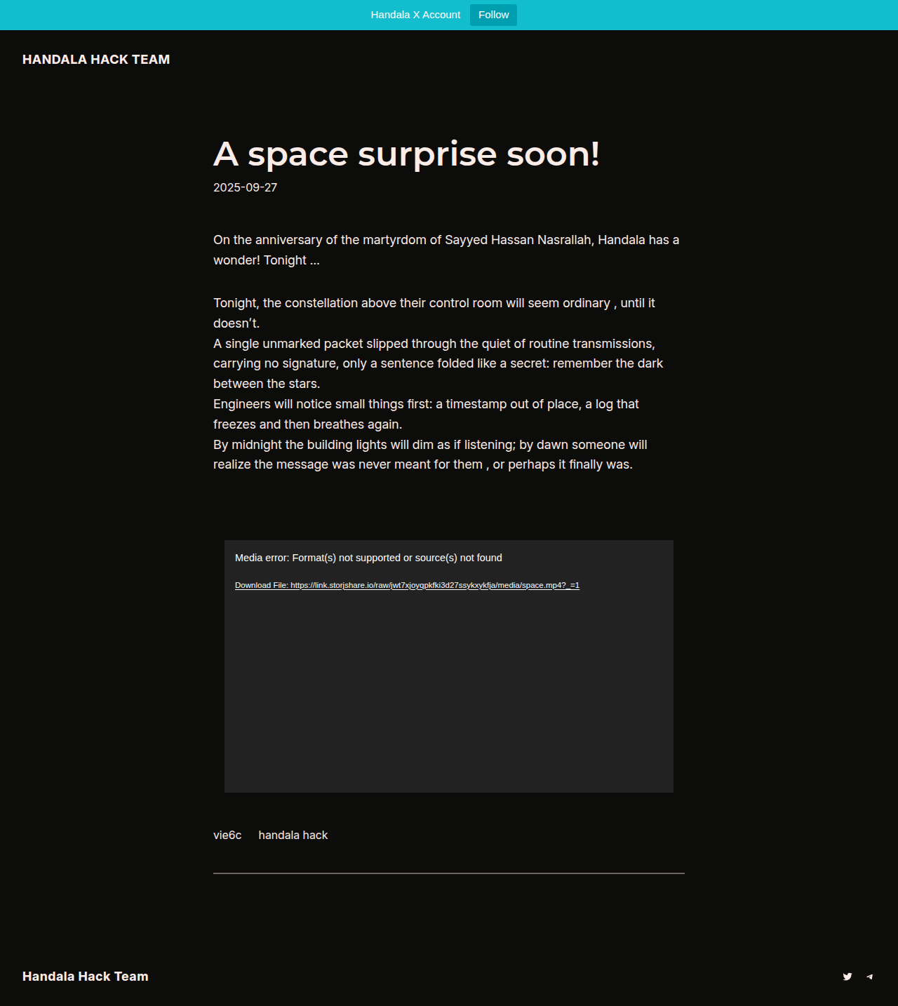 On the anniversary of the martyrdom of Sayyed Hassan Nasrallah, Handala has a wonder! Tonight ⦠Tonight, the constellation above their control room will seem ordinary , until it doesnāt. A single unmarked packet slipped through the quiet of routine transmissions, carrying no signature, only a sentence folded like a secret: remember the dark between⦠|