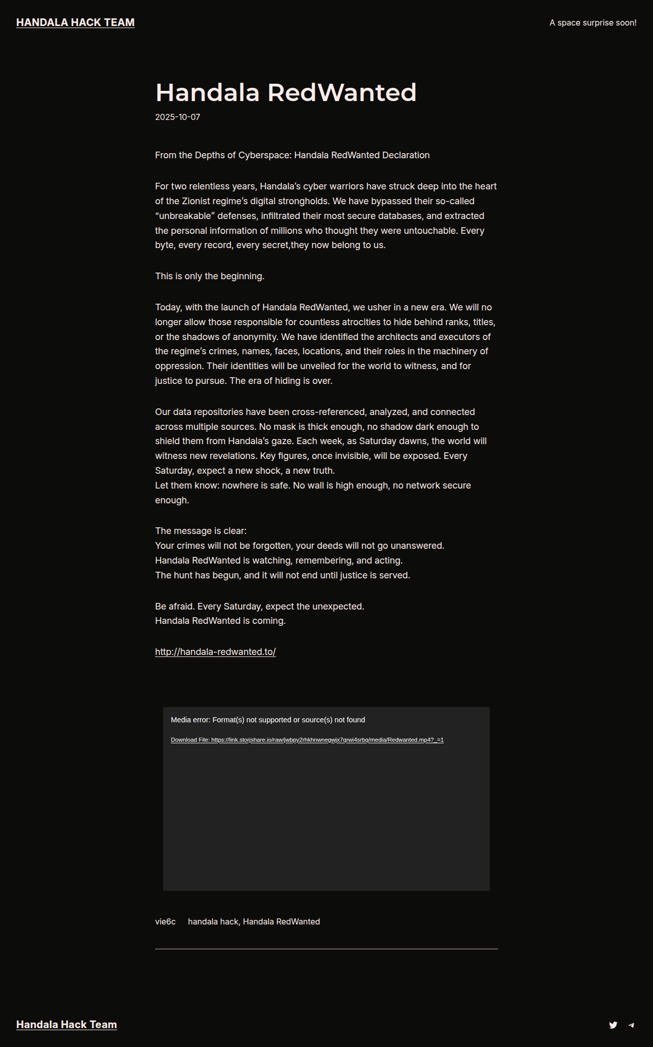 From the Depths of Cyberspace: Handala RedWanted Declaration For two relentless years, Handalaās cyber warriors have struck deep into the heart of the Zionist regimeās digital strongholds. We have bypassed their so-called āunbreakableā defenses, infiltrated their most secure databases, and extracted the personal information of millions who thought they were untouchable. Every byte, every record,⦠|