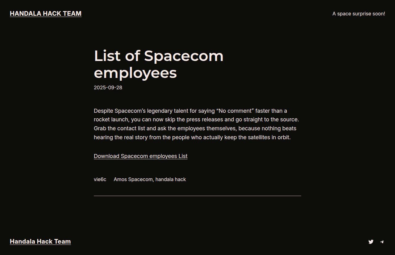 We, the Handala Hack, have successfully breached the security systems of Spacecom (Space Communication Ltd.), the operator of the critical AMOS satellite network. Every piece of sensitive information, including military, governmental, and security data transmitted and stored within their infrastructure, is now fully in our possession. Spacecomās AMOS satellites serve a wide array of functions,⦠|