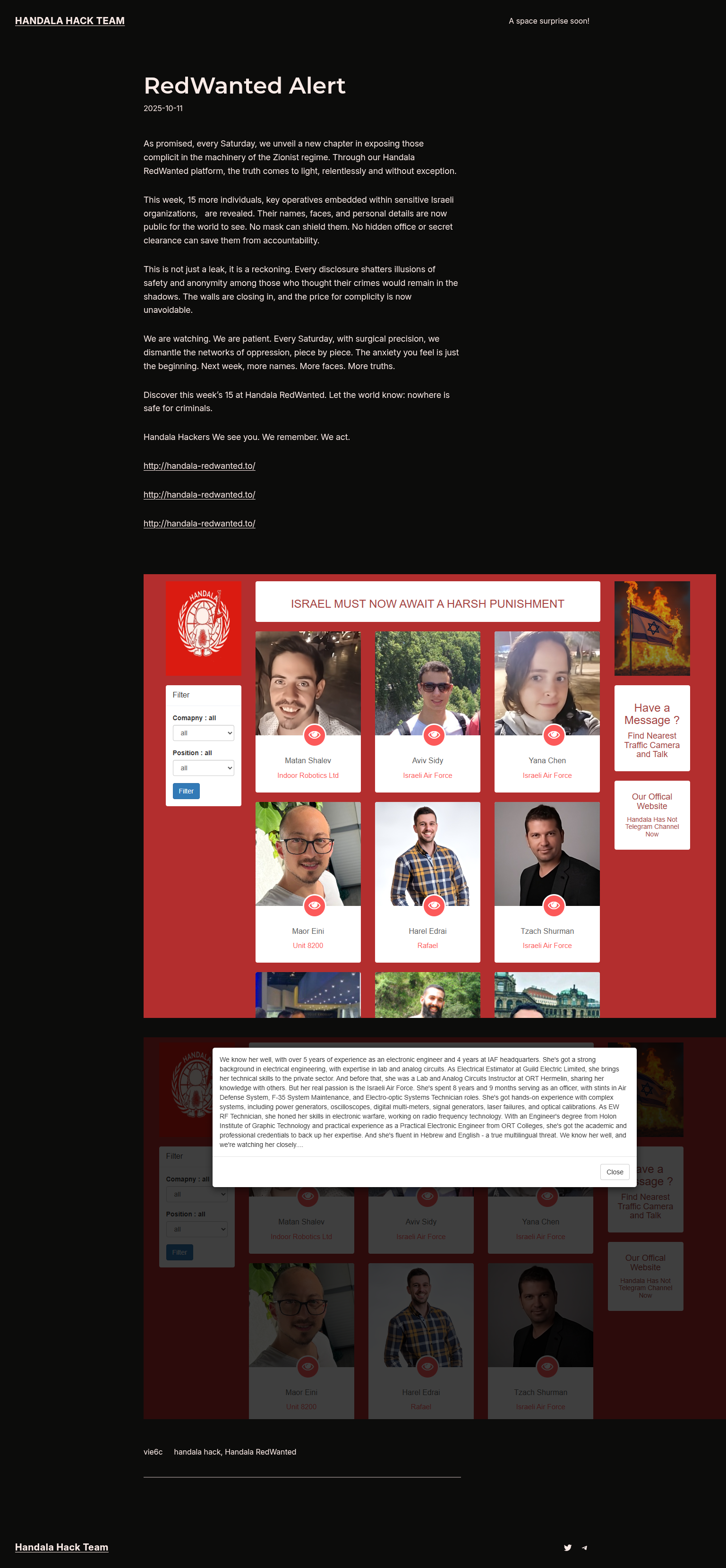 As promised, every Saturday, we unveil a new chapter in exposing those complicit in the machinery of the Zionist regime. Through our Handala RedWanted platform, the truth comes to light, relentlessly and without exception. This week, 15 more individuals, key operatives embedded within sensitive Israeli organizations,  are revealed. Their names, faces, and personal details are⦠|