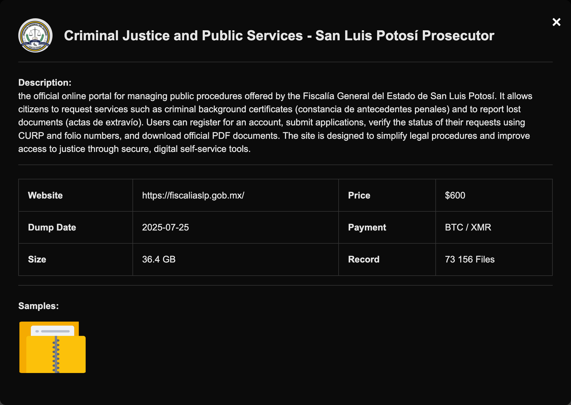 the official online portal for managing public procedures offered by the Fiscalía General del Estado de San Luis Potosí. It allows citizens to request services such as criminal background certificates (constancia de antecedentes penales) and to report lost documents (actas de extravío). Users can register for an account, submit applications, verify the status of their requests using CURP and folio numbers, and download official PDF documents. The site is designed to simplify legal procedures and improve access to justice through secure, digital self-service tools.
