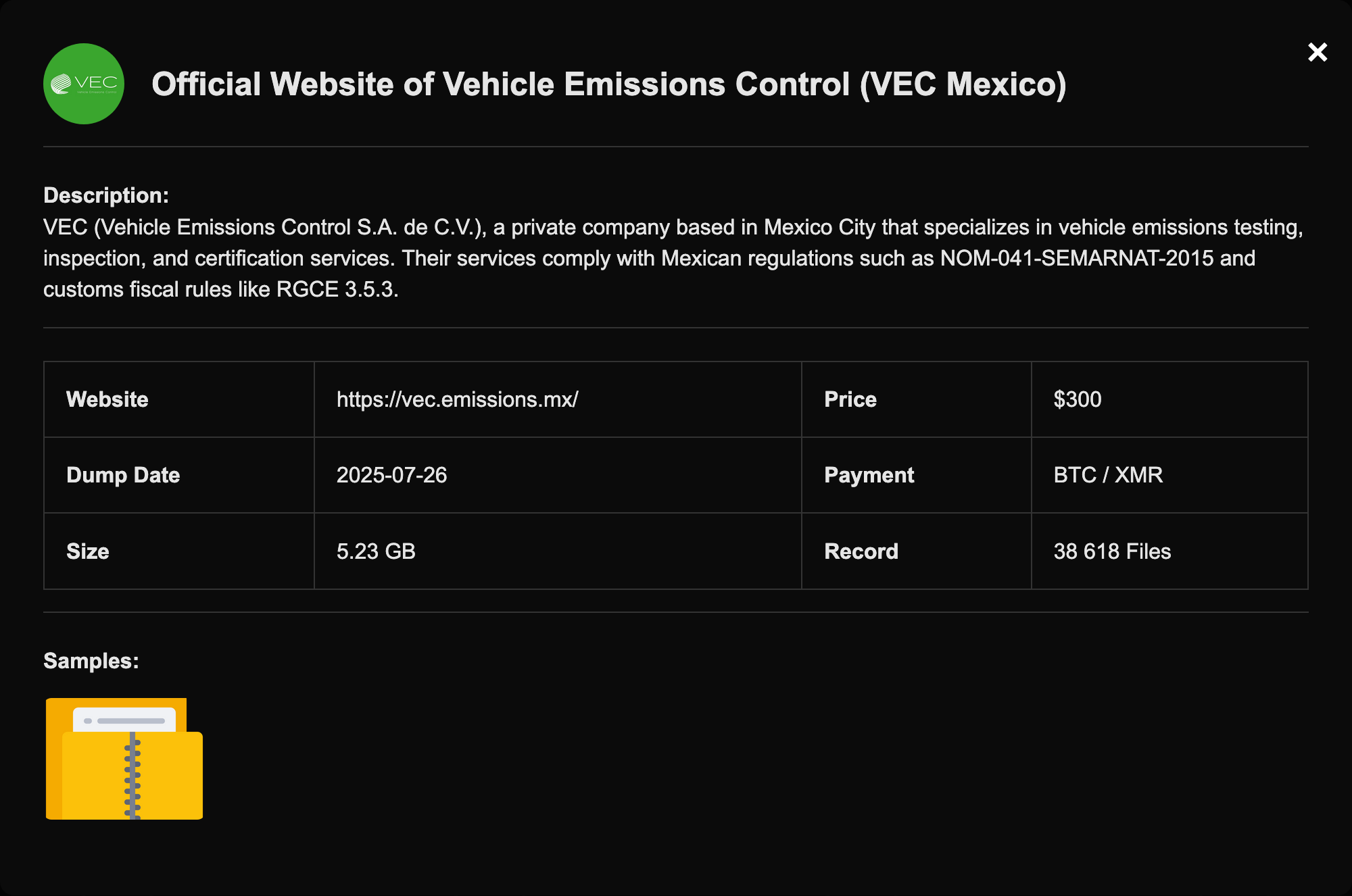 VEC (Vehicle Emissions Control S.A. de C.V.), a private company based in Mexico City that specializes in vehicle emissions testing, inspection, and certification services. Their services comply with Mexican regulations such as NOM‑041‑SEMARNAT‑2015 and customs fiscal rules like RGCE 3.5.3.