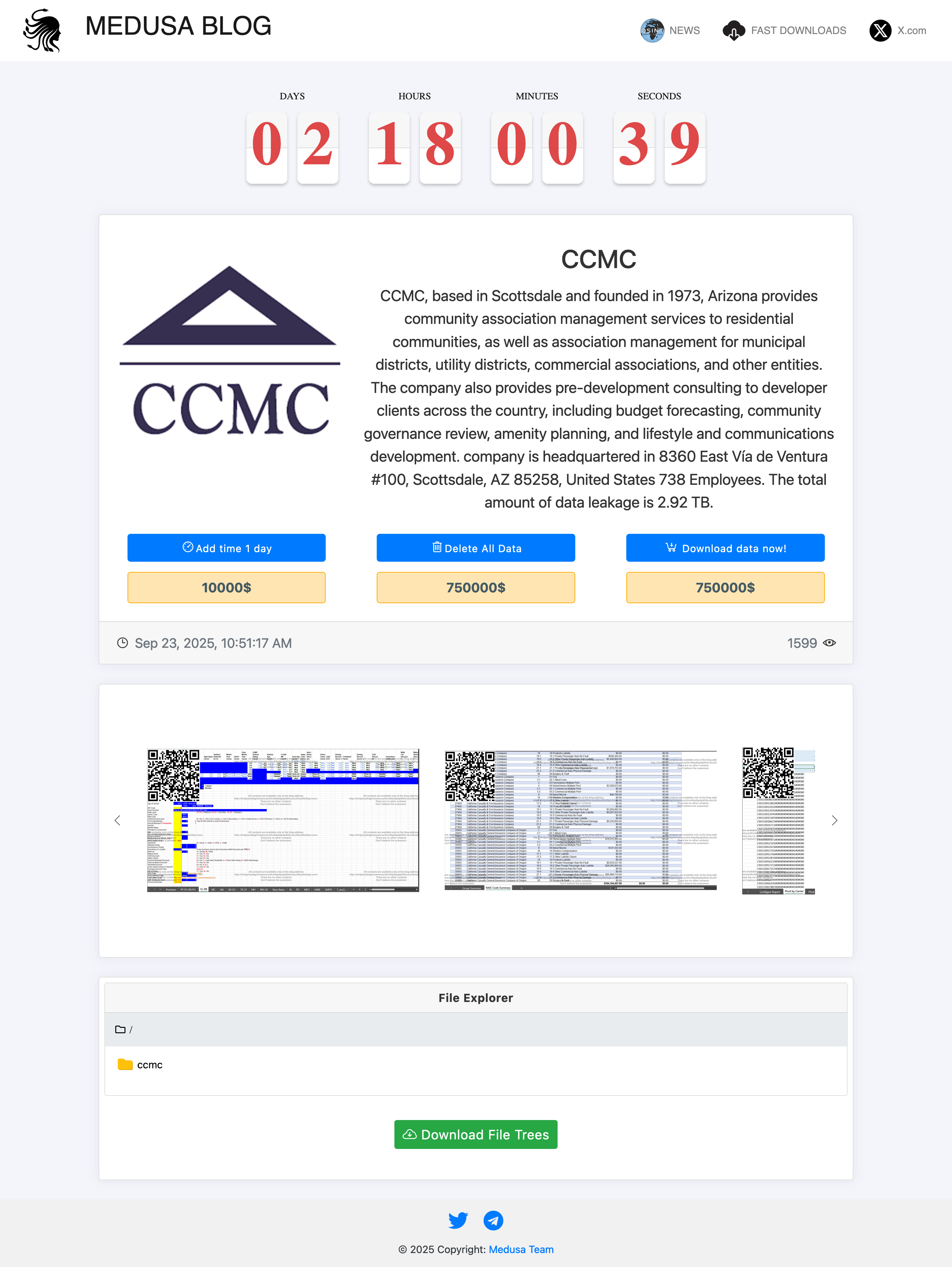 CCMC, based in Scottsdale and founded in 1973, Arizona provides community association management services to residential communities, as well as association management for municipal districts, utility districts, commercial associations, and other entities. The company also provides pre-development consulting to developer clients across the country, including budget forecasting, community governance review, amenity planning, and lifestyle and communications development. company is headquartered in 8360 East VÃa de Ventura #100, Scottsdale, AZ 85258, United States 738 Employees. The total amount of data leakage is 2.92 TB. |