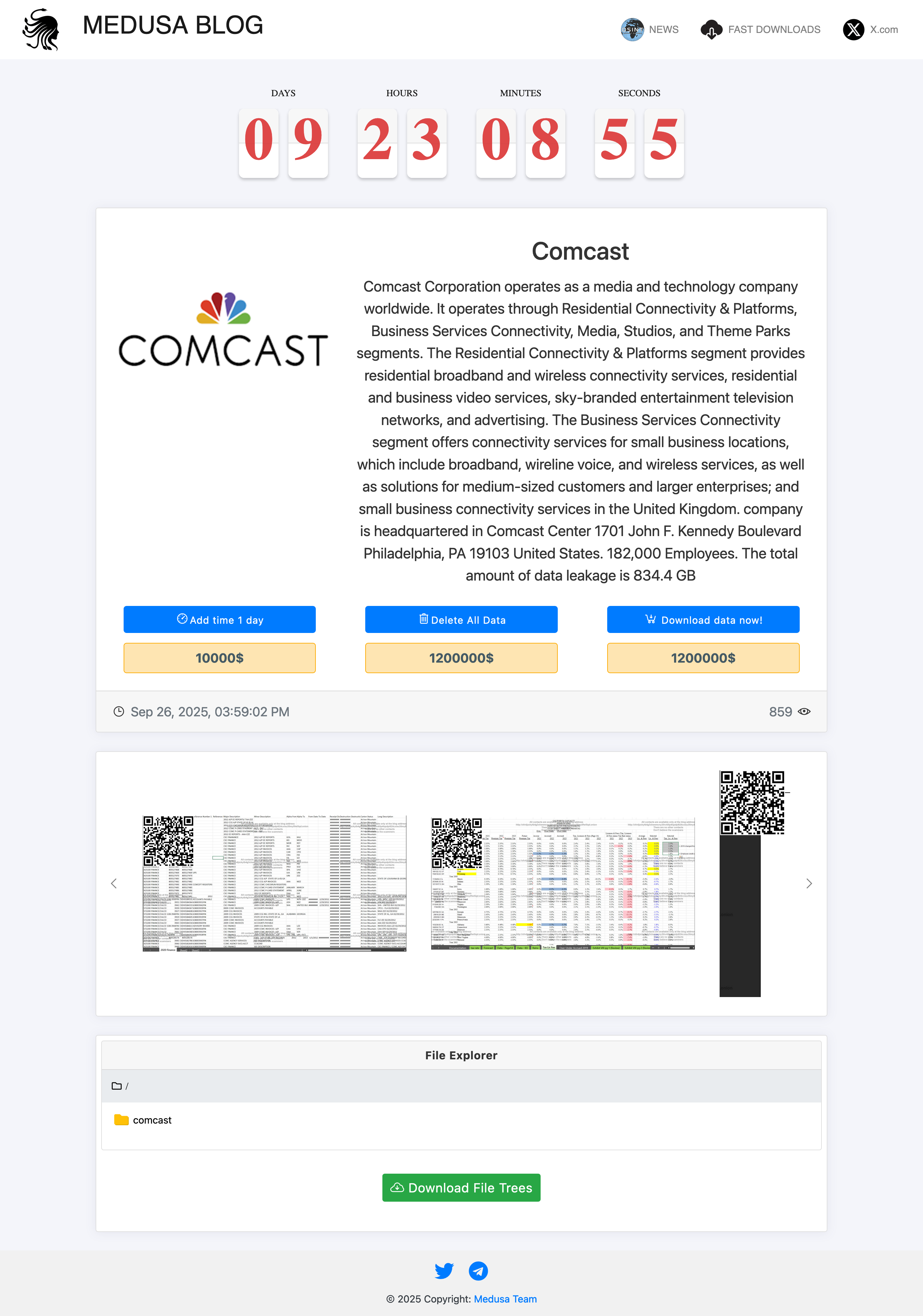 Comcast Corporation operates as a media and technology company worldwide. It operates through Residential Connectivity & Platforms, Business Services Connectivity, Media, Studios, and Theme Parks segments. The Residential Connectivity & Platforms segment provides residential broadband and wireless connectivity services, residential and business video services, sky-branded entertainment television networks, and advertising. The Business Services Connectivity segment offers connectivity services for small business locations, which include broadband, wireline voice, and wireless services, as well as solutions for medium-sized customers and larger enterprises; and small business connectivity services in the United Kingdom. company is headquartered in Comcast Center 1701 John F. Kennedy Boulevard Philadelphia, PA 19103 United States. 182,000 Employees. The total amount of data leakage is 834.4 GB |