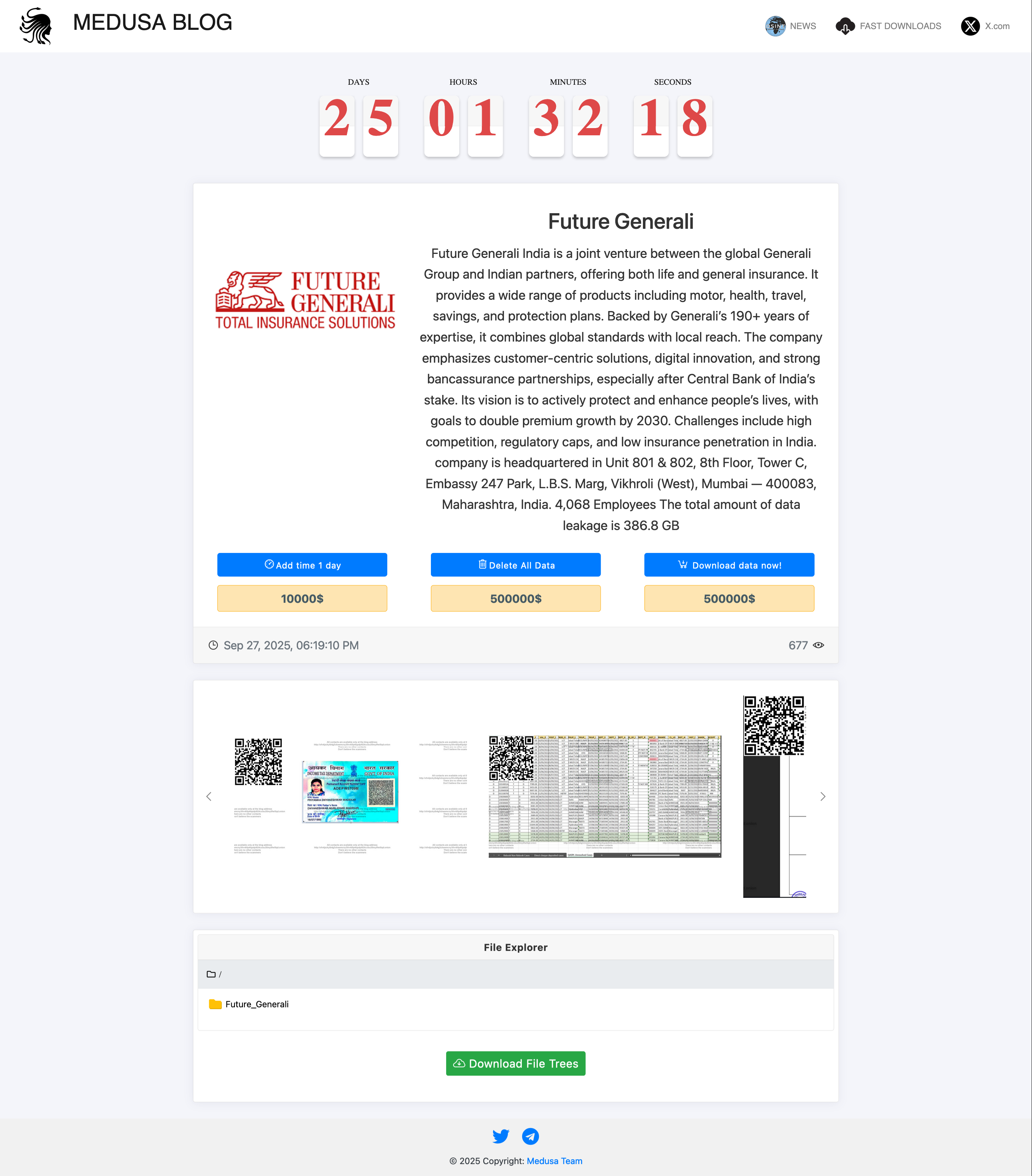 Future Generali India is a joint venture between the global Generali Group and Indian partners, offering both life and general insurance. It provides a wide range of products including motor, health, travel, savings, and protection plans. Backed by Generali’s 190+ years of expertise, it combines global standards with local reach. The company emphasizes customer-centric solutions, digital innovation, and strong bancassurance partnerships, especially after Central Bank of India’s stake. Its vision is to actively protect and enhance people’s lives, with goals to double premium growth by 2030. Challenges include high competition, regulatory caps, and low insurance penetration in India. company is headquartered in Unit 801 & 802, 8th Floor, Tower C, Embassy 247 Park, L.B.S. Marg, Vikhroli (West), Mumbai — 400083, Maharashtra, India. 4,068 Employees The total amount of data leakage is 386.8 GB |
