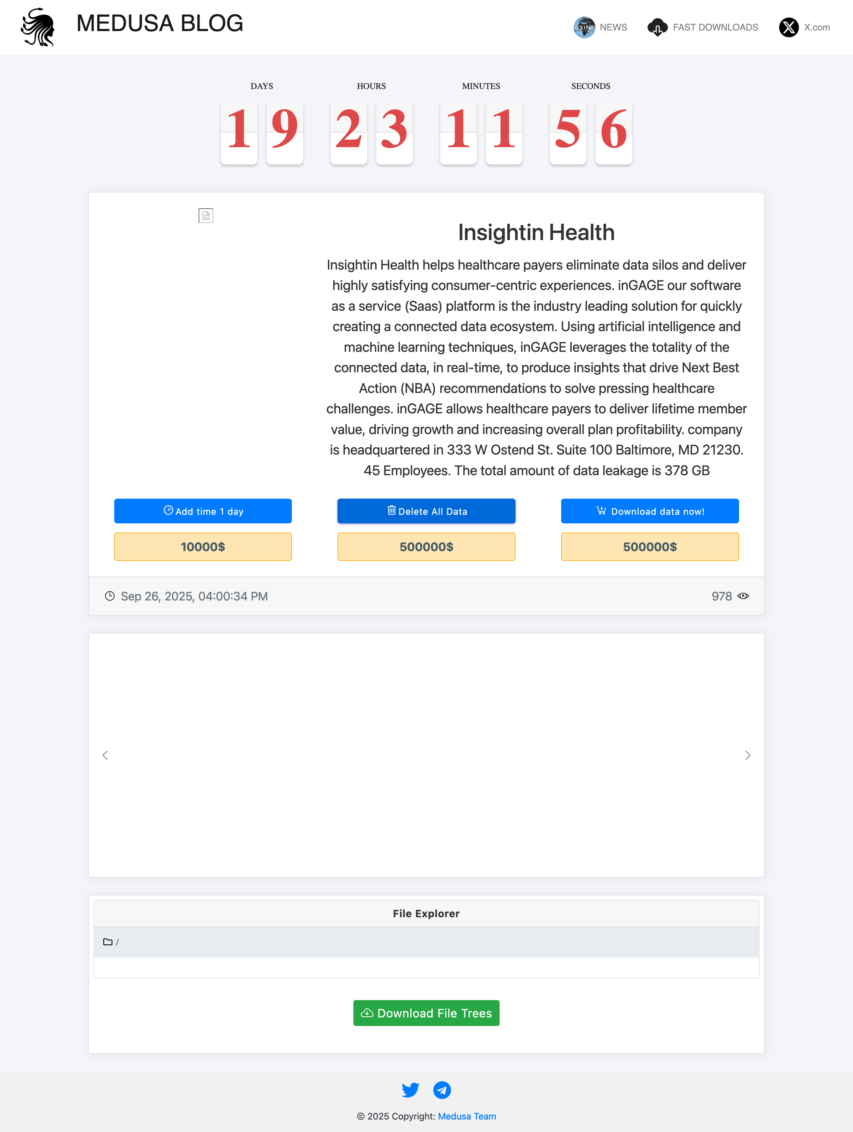 Insightin Health helps healthcare payers eliminate data silos and deliver highly satisfying consumer-centric experiences. inGAGE our software as a service (Saas) platform is the industry leading solution for quickly creating a connected data ecosystem. Using artificial intelligence and machine learning techniques, inGAGE leverages the totality of the connected data, in real-time, to produce insights that drive Next Best Action (NBA) recommendations to solve pressing healthcare challenges. inGAGE allows healthcare payers to deliver lifetime member value, driving growth and increasing overall plan profitability. company is headquartered in 333 W Ostend St. Suite 100 Baltimore, MD 21230. 45 Employees. The total amount of data leakage is 378 GB