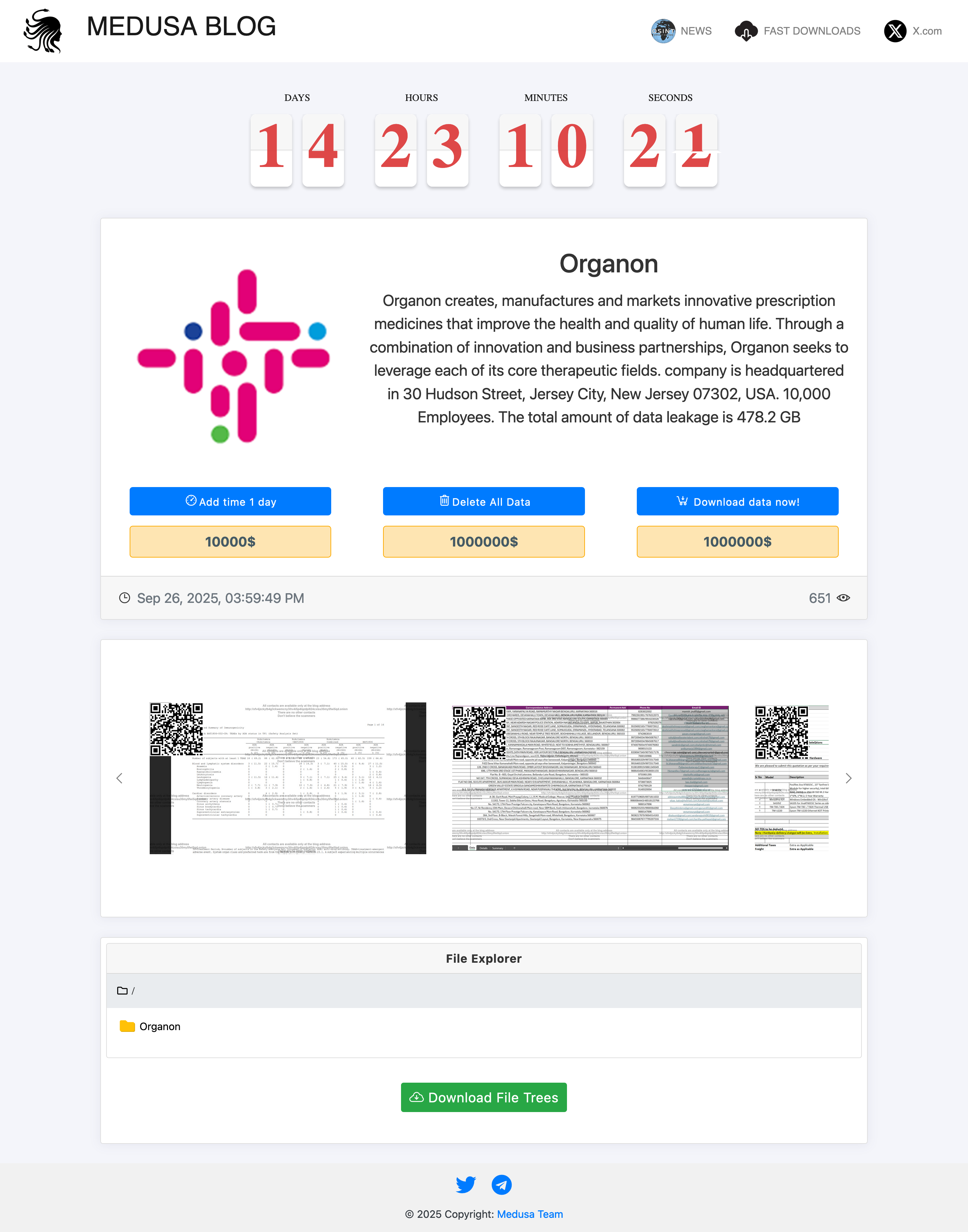 Organon creates, manufactures and markets innovative prescription medicines that improve the health and quality of human life. Through a combination of innovation and business partnerships, Organon seeks to leverage each of its core therapeutic fields. company is headquartered in 30 Hudson Street, Jersey City, New Jersey 07302, USA. 10,000 Employees. The total amount of data leakage is 478.2 GB |