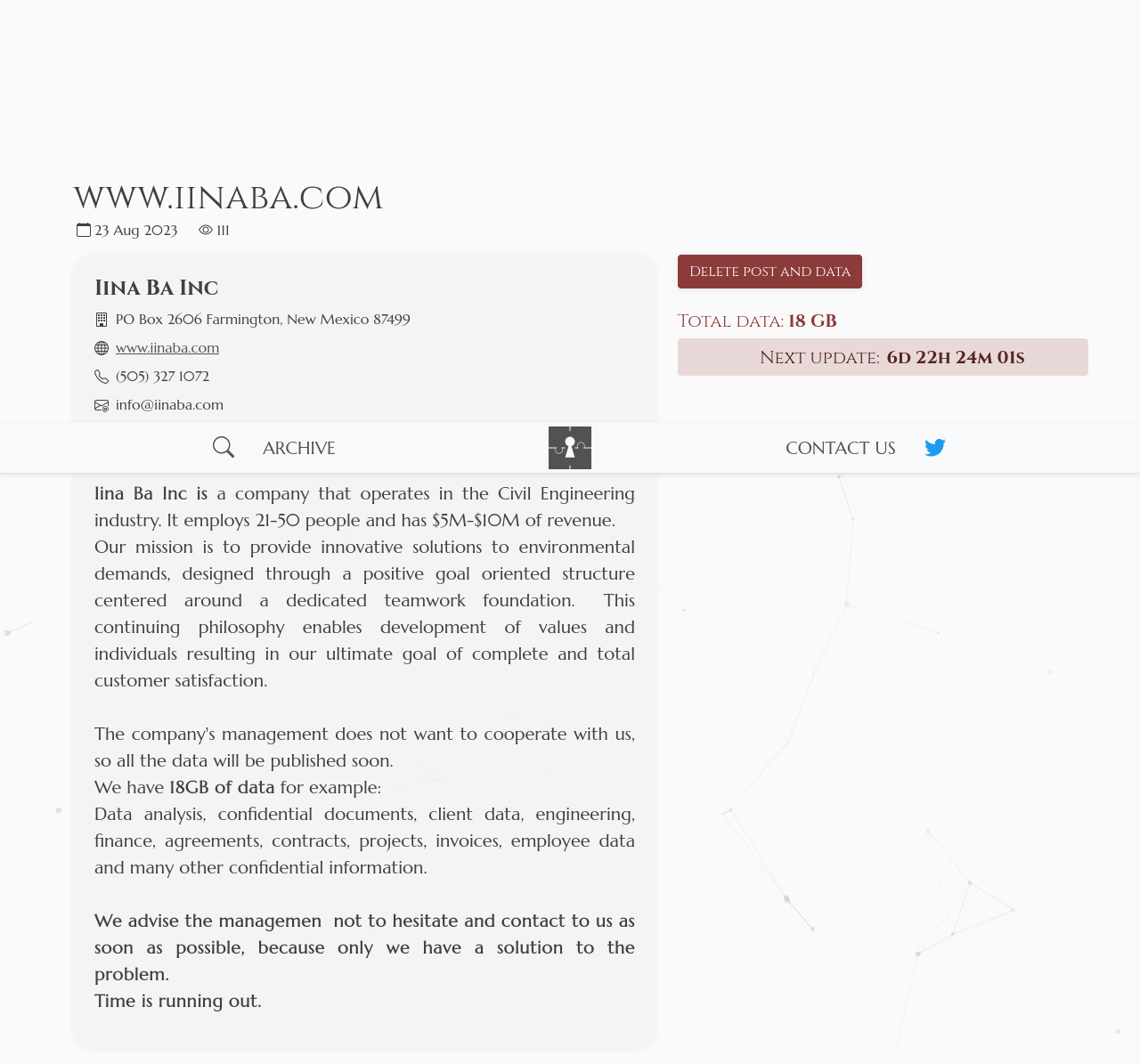 Iina Ba Inc is a company that operates in the Civil Engineering industry. It employs 21-50 people and has $5M-$10M of revenue.Our mission is to provide innovative solutions to environmental demands, designed through a po...