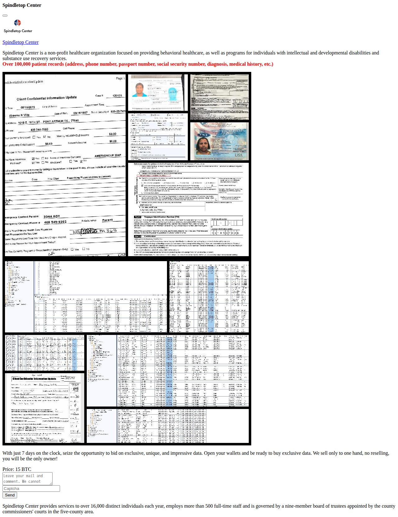 Spindletop Center is a non-profit healthcare organization focused on providing behavioral healthcare, as well as programs for individuals with intellectual and developmental disabilities and substance use recovery services. Over 100,000 patient records (address, phone number, passport number, social security number, diagnosis, medical history, etc.)