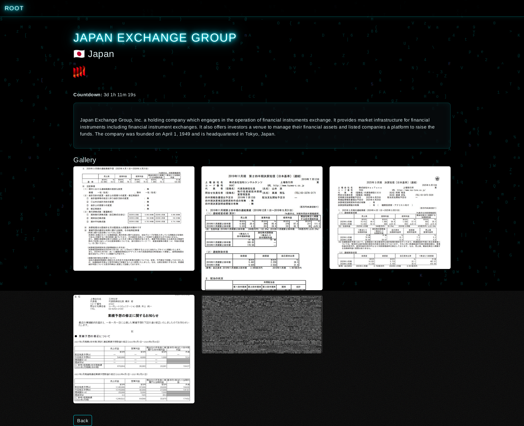 | Japan Exchange Group | Japan Exchange Group, Inc. a holding company which engages in the operation of financial instruments exchange. It provides market infrastructure for financial instruments including financial instrument exchanges. It also offers investors a venue to manage their financial assets and listed companies a platform to raise the funds. The company was founded on April 1, 1949 and is headquartered in Tokyo, Japan. | Screen |