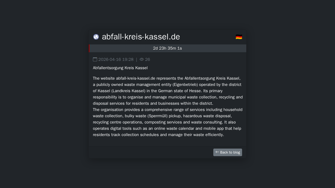 The website abfall-kreis-kassel.de represents the Abfallentsorgung Kreis Kassel, a publicly owned waste management entity (Eigenbetrieb) operated by the district of …
