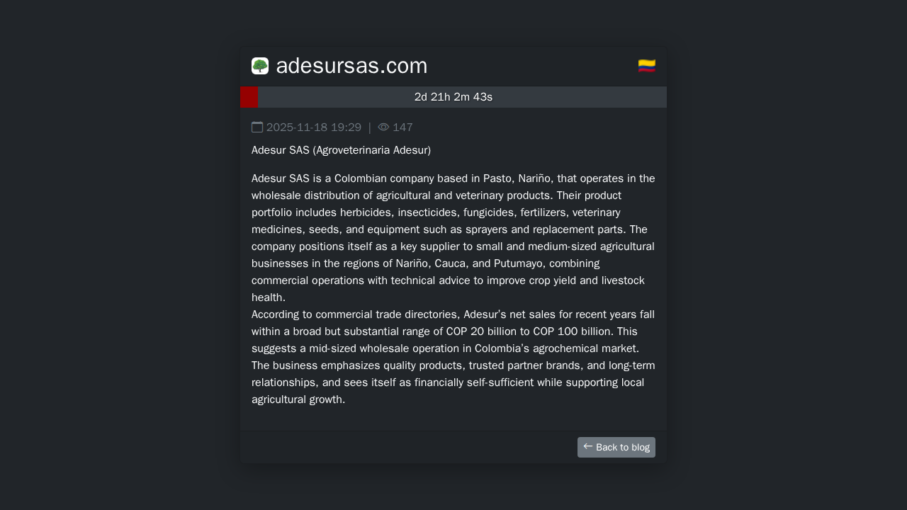 Adesur SAS is a Colombian company based in Pasto, Nariño, that operates in the wholesale distribution of agricultural and veterinary …