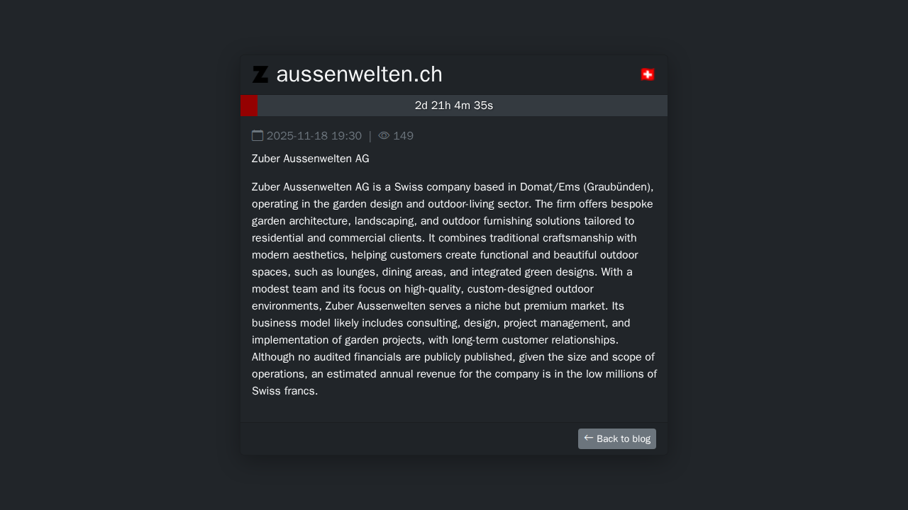 Zuber Aussenwelten AG is a Swiss company based in Domat/Ems (Graubünden), operating in the garden design and outdoor-living sector. The …