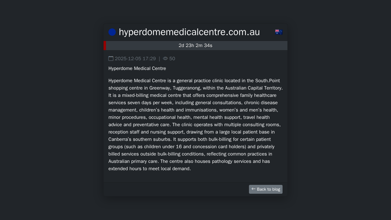 Hyperdome Medical Centre is a general practice clinic located in the South.Point shopping centre in Greenway, Tuggeranong, within the Australian …