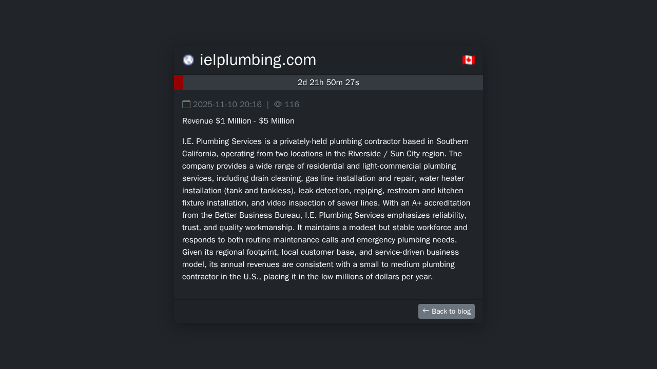 I.E. Plumbing Services is a privately-held plumbing contractor based in Southern California, operating from two locations in the Riverside / …