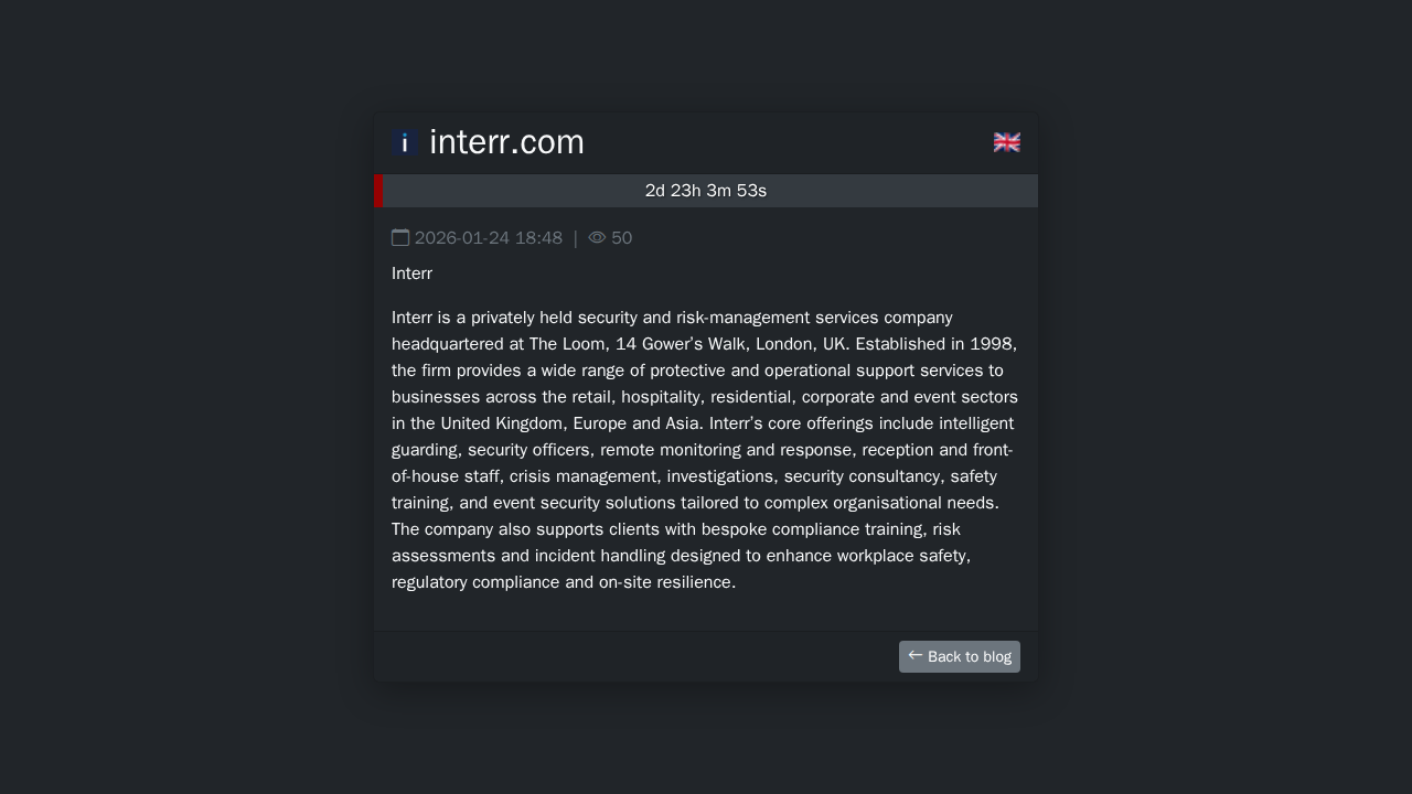 Interr is a privately held security and risk-management services company headquartered at The Loom, 14 Gower’s Walk, London, UK. Established …