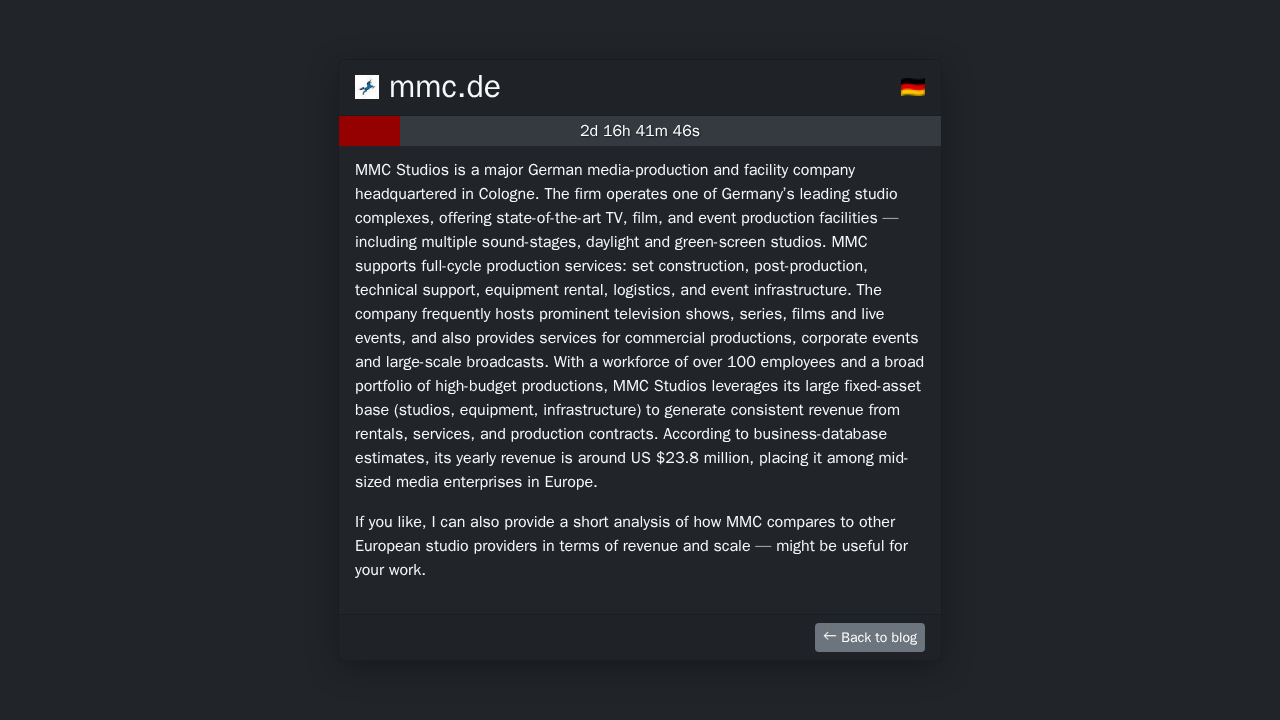 MMC Studios is a major German media-production and facility company headquartered in Cologne. The firm operates one of Germany’s leading …