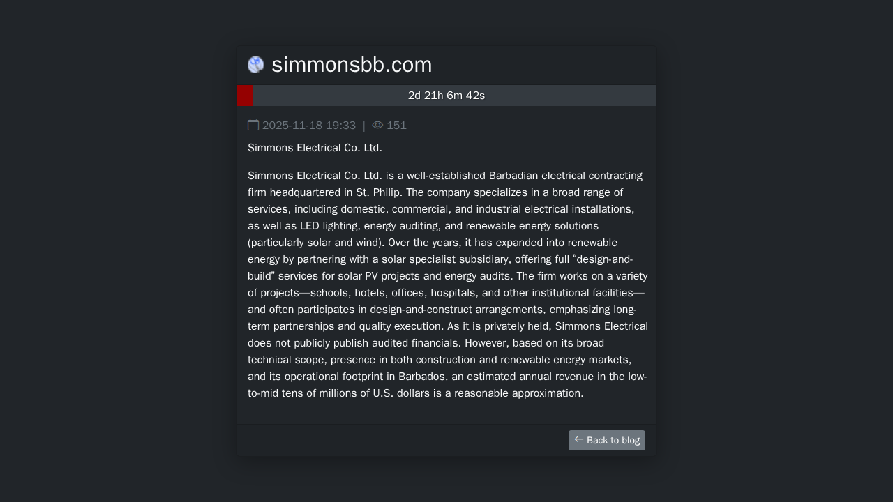 Simmons Electrical Co. Ltd. is a well-established Barbadian electrical contracting firm headquartered in St. Philip. The company specializes in a …