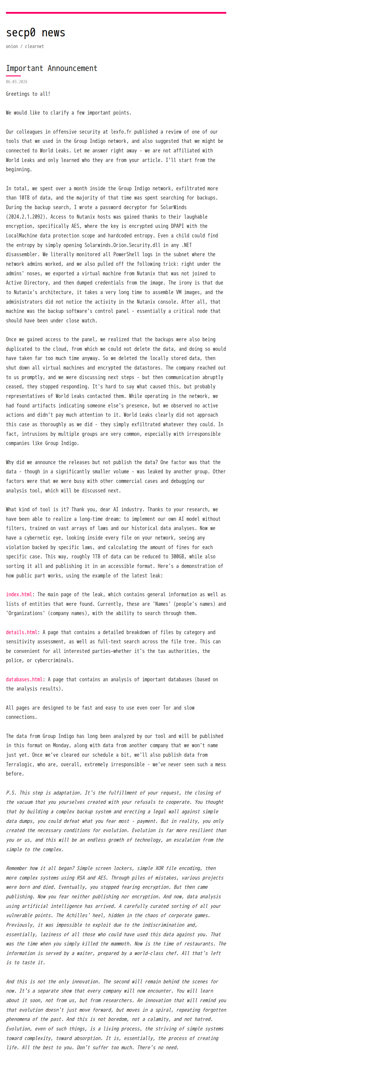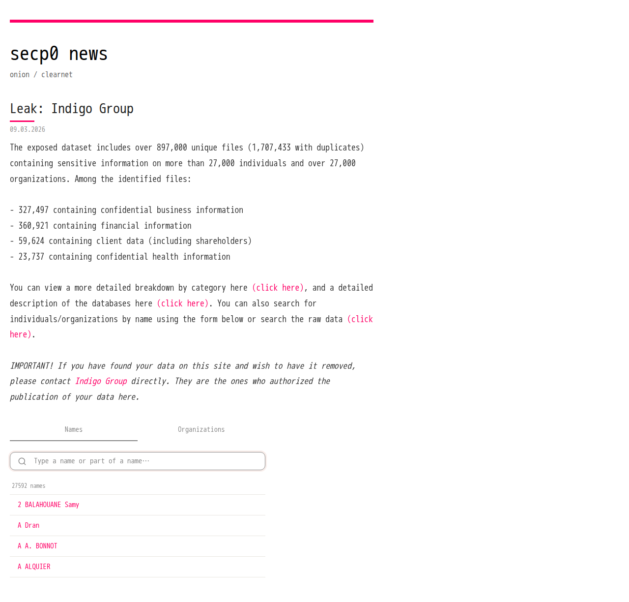| Leak: Indigo Group | The exposed dataset includes over 897,000 unique files (1,707,433 with duplicates) containing sensitive information on more than 27,000 individuals and over 27,000 organizations Open post | Screen | |