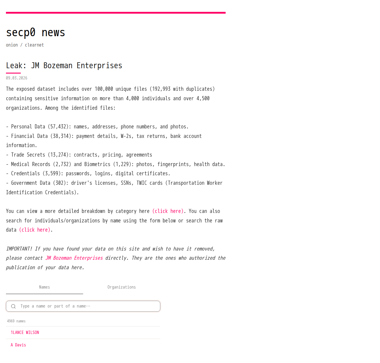 | Leak: JM Bozeman Enterprises | The exposed dataset includes over 100,000 unique files (192,993 with duplicates) containing sensitive information on more than 4,000 individuals and over 4,500 organizations Open post | Screen | |