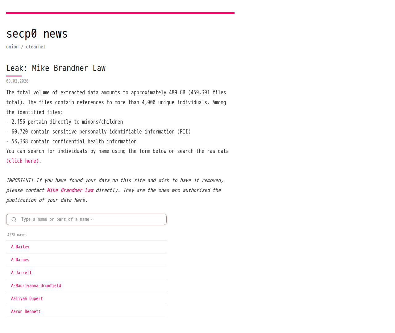 | Leak: Mike Brandner Law | The total volume of extracted data amounts to approximately 489 GB (459,391 files total). The files contain references to more than 4,000 unique individuals... Open post | Screen | |