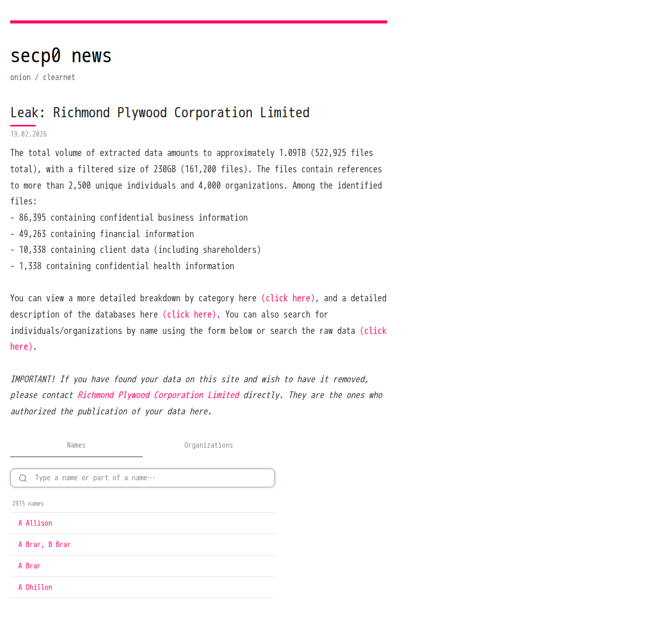 | Leak: Richmond Plywood Corporation Limited | The total volume of extracted data amounts to approximately 1.09TB (522,925 files total), with a filtered size of 230GB (161,200 files). The files contain references to more than 2,500 unique individuals and 4,000 organizations... Open post | Screen | |