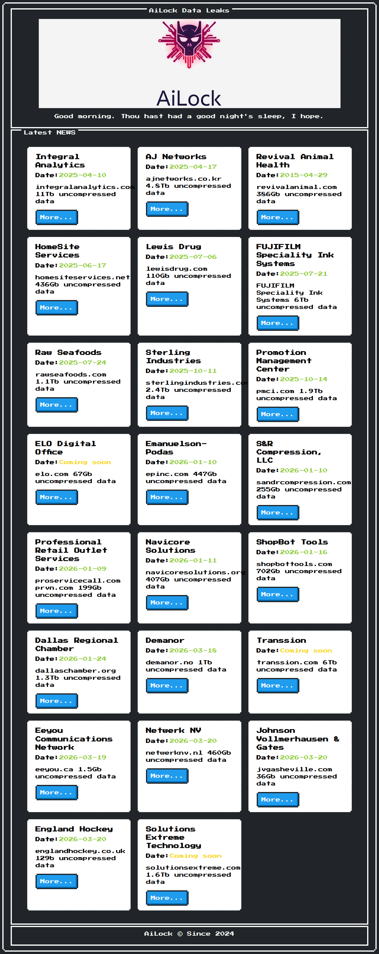 AiLock is a Ransomware-as-a-Service (RaaS) group first identified in March 2025. It employs a double-extortion approach—encrypting files and threatening to report breaches to regulators or share stolen data with competitors if the ransom isn’t paid. Victims have just 72 hours to respond and up to five days to pay; failure to pay results in data leaks and destruction of recovery tools. The ransomware appends the extension .AiLock to encrypted files, changes file icons to a green padlock with the “AiLock” name, and replaces the desktop wallpaper with a distinctive robot-skull logo. It employs a hybrid encryption scheme, combining ChaCha20 for file encryption with NTRUEncrypt for securing metadata, and uses a multi-threaded design (path-traversal and encryption threads with IOCP) for efficiency. While active campaigns and leak sites are confirmed, specific sectors, regions, and intrusion methods remain undisclosed in public sources.