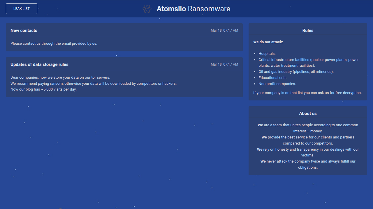 AtomSilo emerged in September 2021 and ceased operations by year-end 2021. It functioned with a double‑extortion model, combining file encryption with data exfiltration and leak threats. The malware uses a hybrid encryption scheme—AES‑256 for file encryption and RSA‑4096 to secure the AES key—and appends the extension .ATOMSILO to encrypted files. Ransom notes follow formats like README-FILE-{computer name}-{timestamp}.hta or ATOMSILO-README.hta. Structurally and operationally, AtomSilo closely resembles the LockFile ransomware and is attributed to the Chinese state-linked actor BRONZE STARLIGHT (aka Cinnamon Tempest, DEV‑0401, Emperor Dragonfly, SLIME34), likely serving as a smokescreen for espionage-driven data theft. Victims spanned multiple industries and countries, including notable high extortion demands up to $1 million USD. The group also exploited the Atlassian Confluence vulnerability (CVE‑2021‑26084) for initial access and used DLL side‑loading for stealthy deployment.